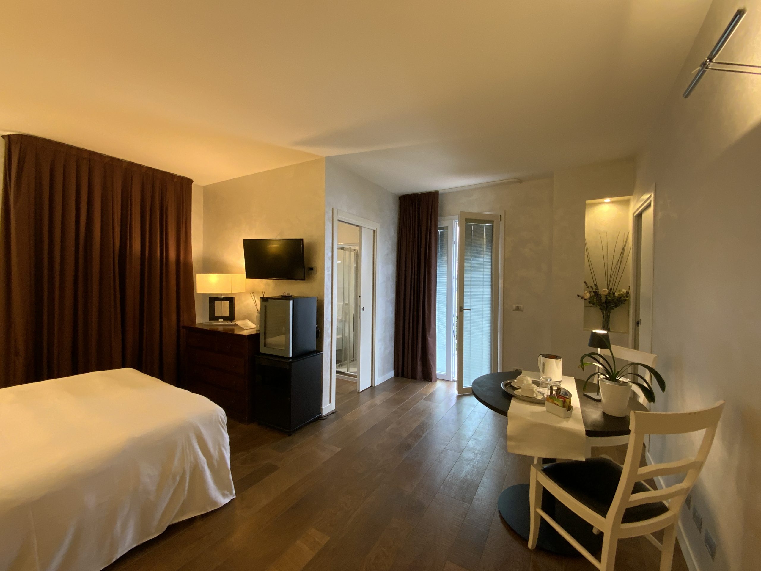 Camera Junior Suite con letto matrimoniale, bagno privato e due balconi arredati.